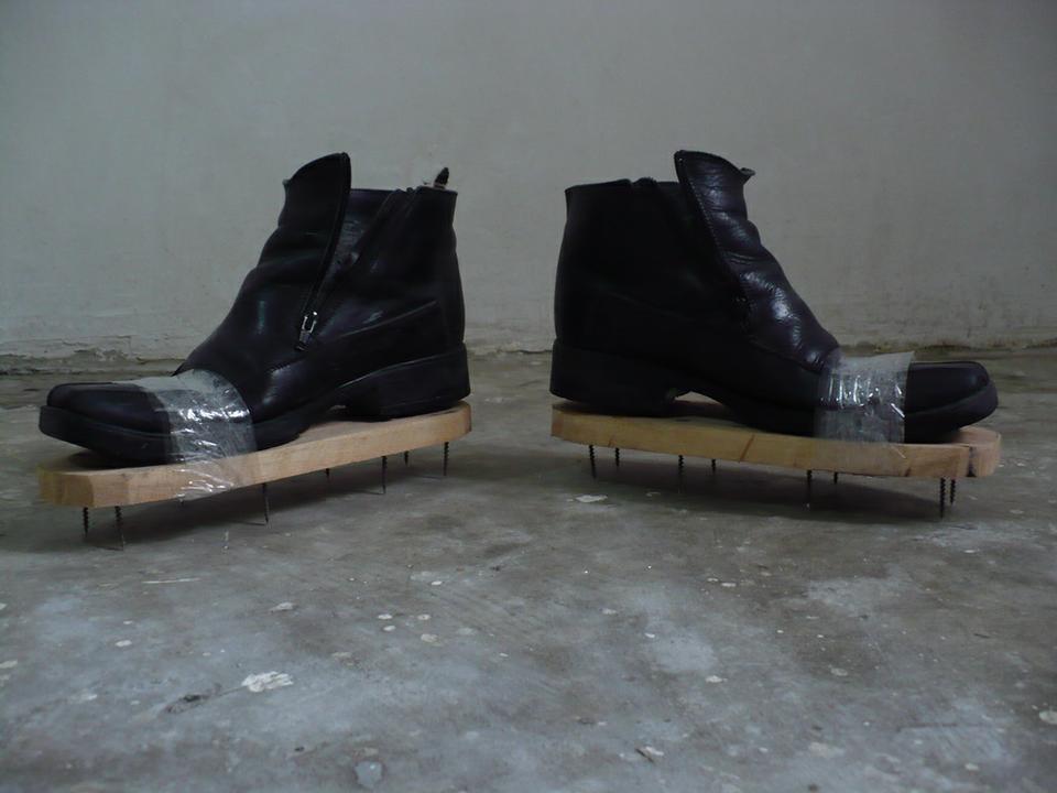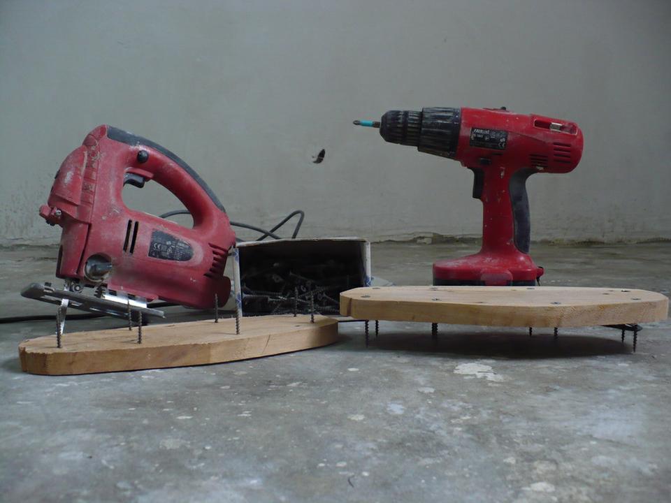 Перед тем как замешивать смесь наливного пола, делаем деревянную подошву под размер обуви с вкрученными в неё саморезами. Это делается для того, чтобы после нанесения наливного пола можно было по нему ходить, не наступая всей ступней.
