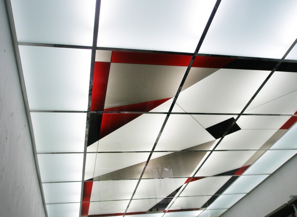 Потолок из матового стекла, так же, как и из прозрачного акрила, обладает высокой прочностью и влагоустойчив. Кроме этого, такие потолки могут покрываться разнообразными изображениями, рисунками и затейливыми узорами.