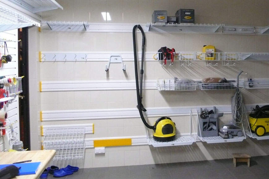 Когда в гараже много полок и стеллажей, это огромный плюс, но следует задуматься о том, куда вешать рабочую одежду и складывать некоторые специфические вещи.