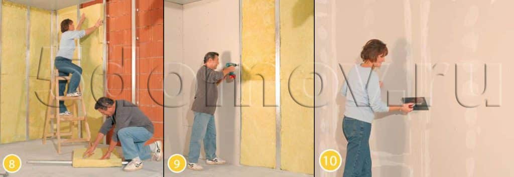 Между стойками каркаса можно установить плиты из минеральных волокон — это уменьшит влажность в помещении и увеличит звуко- и теплоизоляцию стен (8).