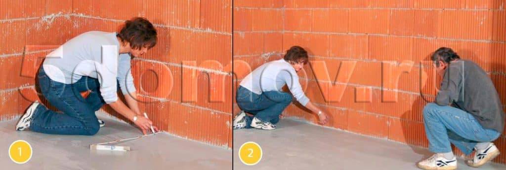 Далее стену необходимо покрыть специальным гидроизоляционным средством, чтобы подготовить ее к последующей укладке плитки. Его следует наносить с помощью кисти, желательно в два слоя. Плитка укладывается с помощью плиточного клея после высыхания гидроизоляционного материала, как и любая другая поверхность во влажном помещении.