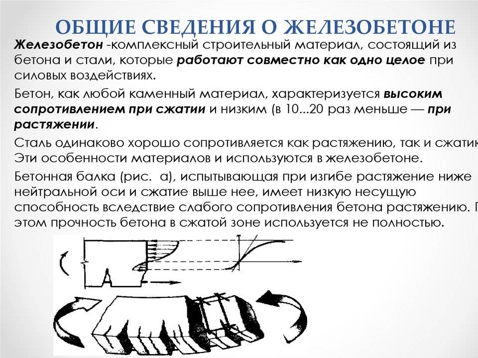 Железобетон — это монолит из стальной арматуры и бетона. Взаимодействие данных материалов является очень эффективным. Бетонный камень надежно сцепляется с металлом, хорошо защищая его от ржавления. Эти компоненты дополняют друг дружку по стойкости к разным нагрузкам.