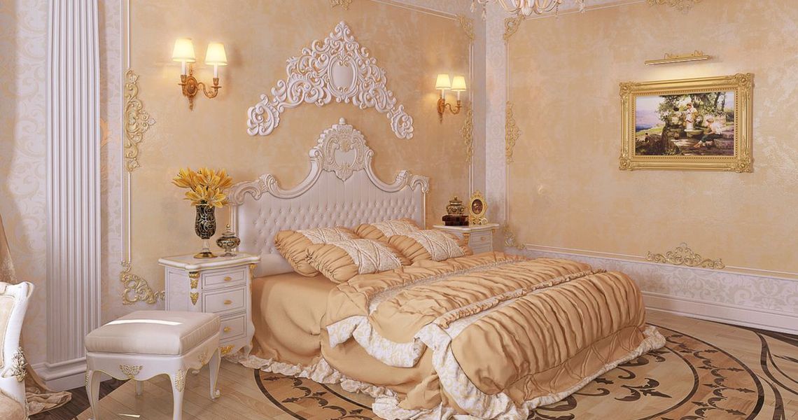 Самое узнаваемое цветовое сочетание стиля – золото на белом. Оно подчеркивает статус владельца, создает великолепие интерьера. Вместо белого можно использовать пастельные бежевый, песочный, а также персиковый.
