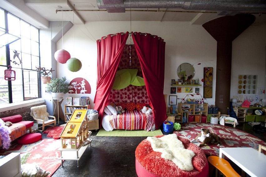 Для детской стиль бохо подходит как нельзя лучше. Сказочная яркая комната, как из сказки, понравится любому ребенку. Оформить помещение лучше в светлых тонах, а пестроту передать с помощью текстиля. Яркие ковры, одеяла из лоскутов, детские игрушки и поделки – все это привнесет в помещение дух стиля бохо. Одну из стен можно вообще выкрасить грифельной краской, чтобы дети проявляли свой творческий потенциал.