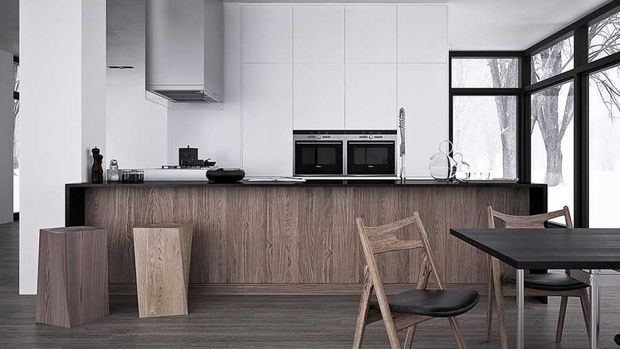 Если по какой-то причине реализовать такой подход невозможно, то стараются спрятать за прямым фасадом без ручек встроенную бытовую технику.