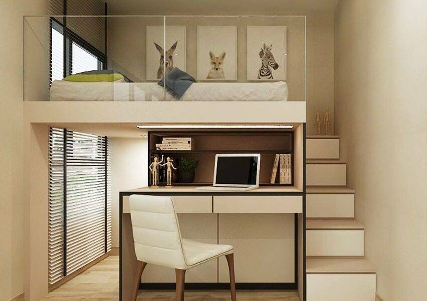 если позволяет высота потолка, можно установить двухуровневую конструкцию, где верхнее место будет отведено для спального места, а нижнее — для хранения вещей и рабочего уголка.