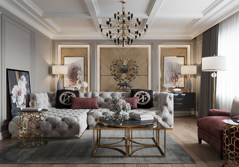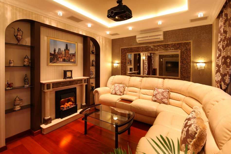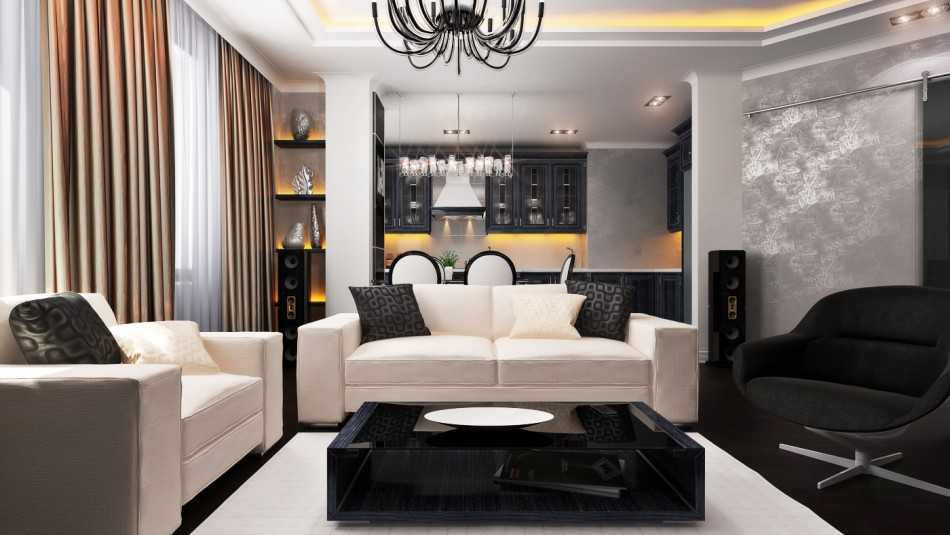 Мебель должна быть выдержана в одном стиле. Диванную зону можно расположить в центре комнаты буквой «п» или «г», со столом посередине. Крупная люстра в центре комнаты и аксессуары в стиле модерн завершат оформление гостиной.