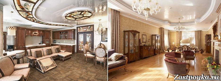 Потолок одновременно нейтральный и привлекающий внимание. То есть, светлый (желательно теплый белый) цвет разбавляется богатым декором с растительным узором, витражами, громоздкими светильниками, лепниной
