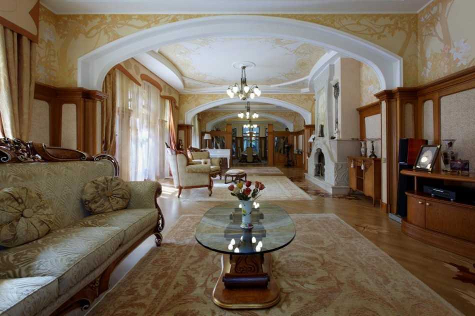 Стиль Модерн в интерьере на фото можно определить по изящным аркам вместо привычных прямоугольных дверных проемов и округлых верхних частей окон. Лестницы на верхний этаж плавно изгибаются, имеют непростую конструкцию и одновременно с этим кажутся легкими и изящными.