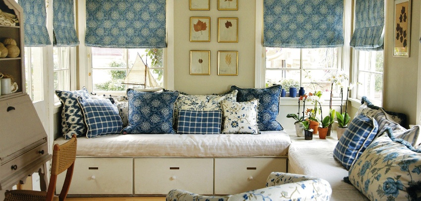 - лейтмотив стиля- мелкий цветочек. Флористический принт может быть на любом текстиле – занавески, обивка мебели, покрывала, ковры.