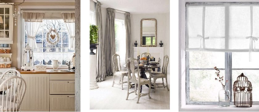 Текстиль в шебби-шике должен присутствовать во всем – от воздушных штор до абажуров для настольных ламп и бра. Декор для окон в противовес всему остальному достаточно сдержанный: легкие и воздушные ткани, простой крой или полное отсутствие гардин. Расцветка занавесок предполагает неброский цветочный принт или вовсе белый либо сдержанные цвета без всякого рисунка.