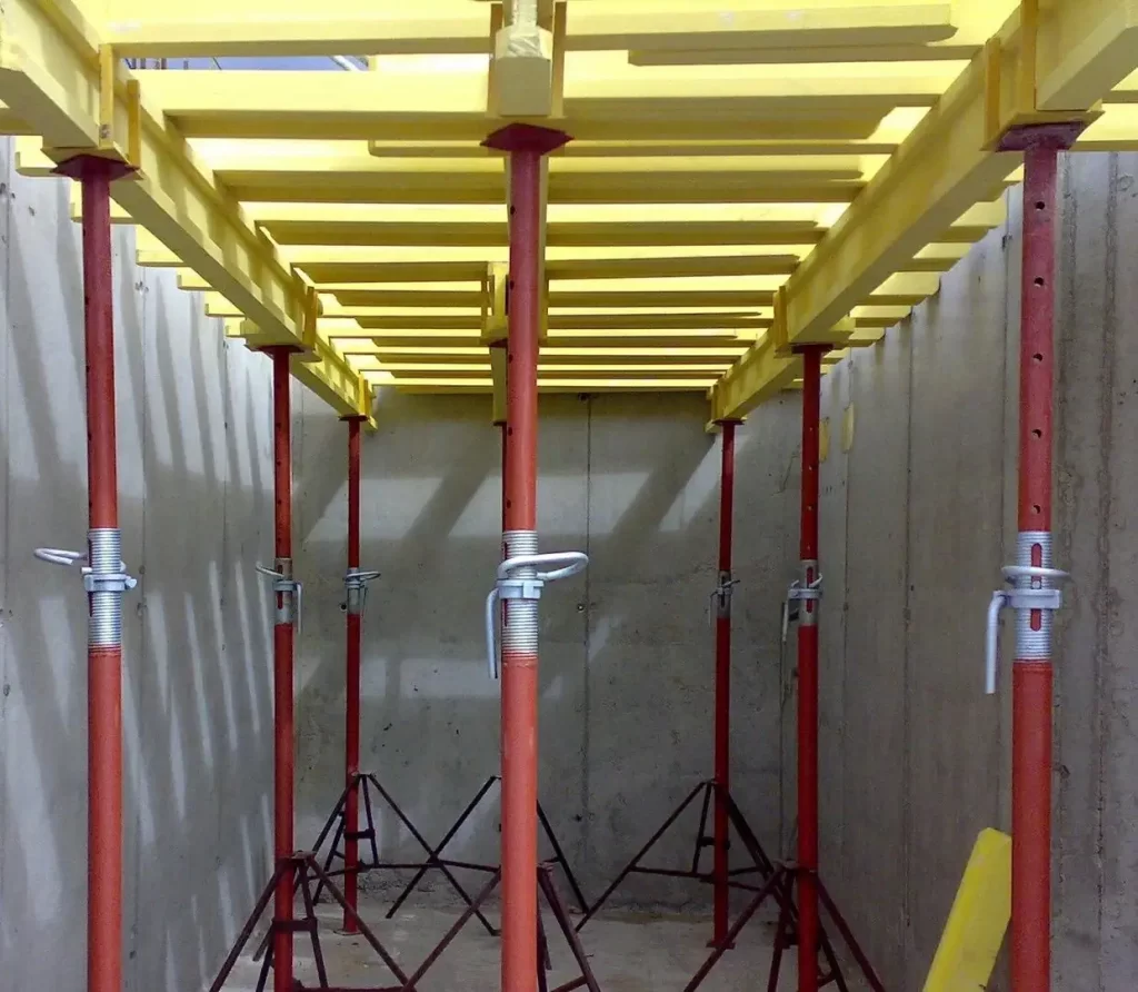 Поддерживающие стойки под опалубку межэтажных пролетов — не все составляющие надежной системы. Конструкция для бетонирования перекрытий включает и другие элементы: