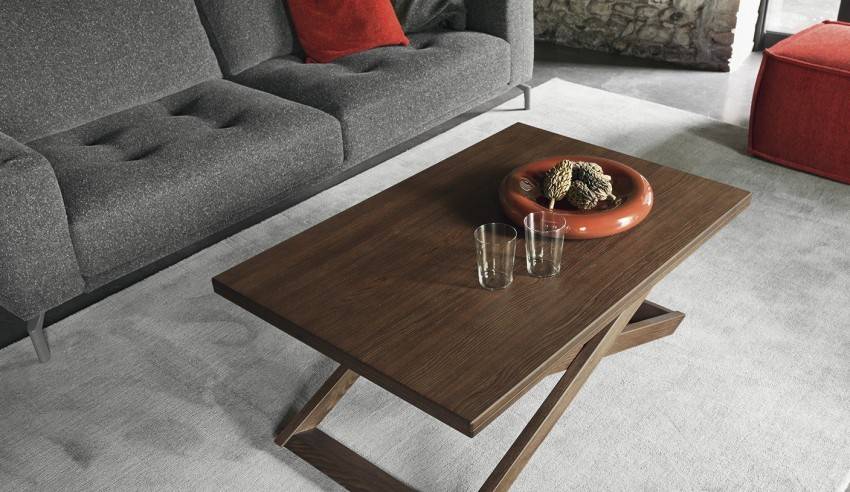 Стильно выглядят в современных интерьерах столы со скрещенными ножками, которые легко поднимаются и увеличиваются в высоту.