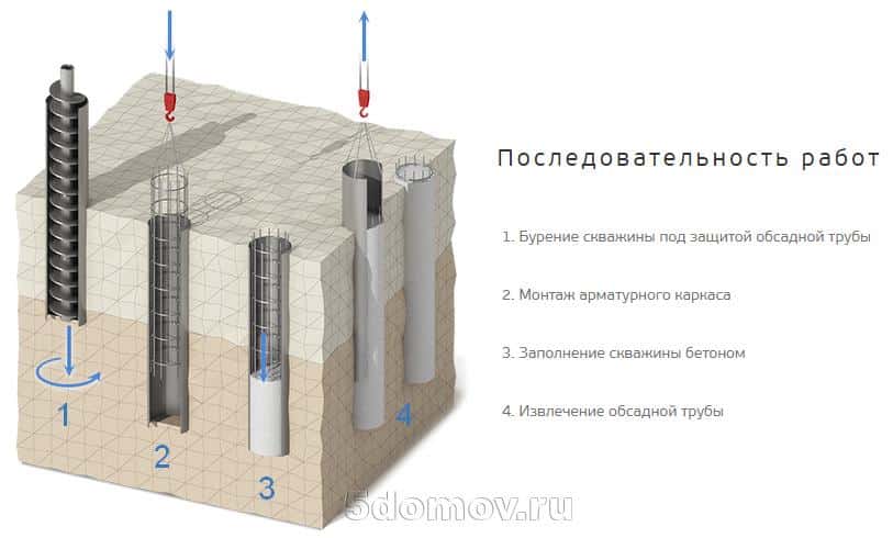 - Формируются скважины под последующую установку опорных элементов. Для этой цели используется ручной буровой инструмент;