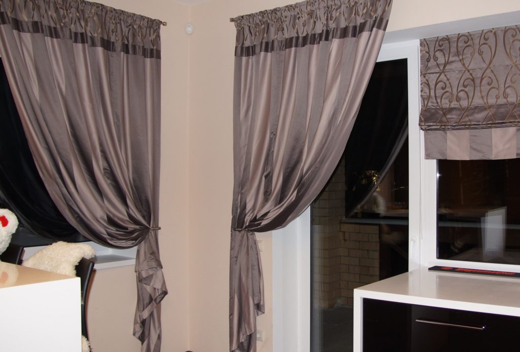 Для окна и двери могут использоваться различные ткани. Вместе с тем более 3 расцветок и фактур использовать нежелательно. Объединить в единую композицию разные части комплекта можно простым способом.