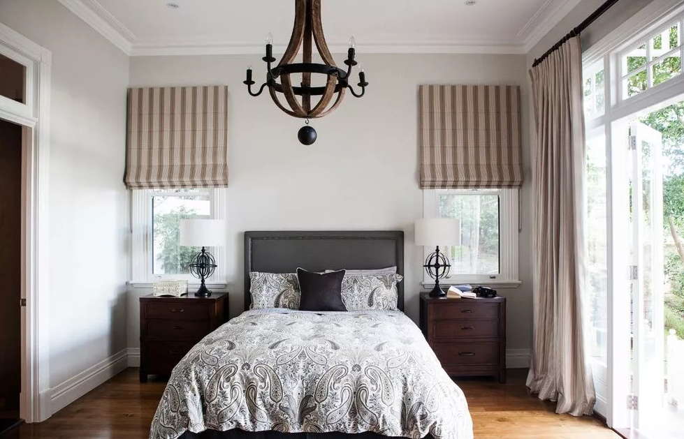 Если комната оформляется без излишеств, стоит использовать римские или рулонные шторы, которые несут скорее утилитарную функцию, не привлекая к себе внимания. Также они уместны в небольших спальнях и там, где мебель стоит у окна. Более практичным вариантом декорирования оконного проема являются жалюзи – при необходимости хорошо перекрывают поток солнечных лучей.