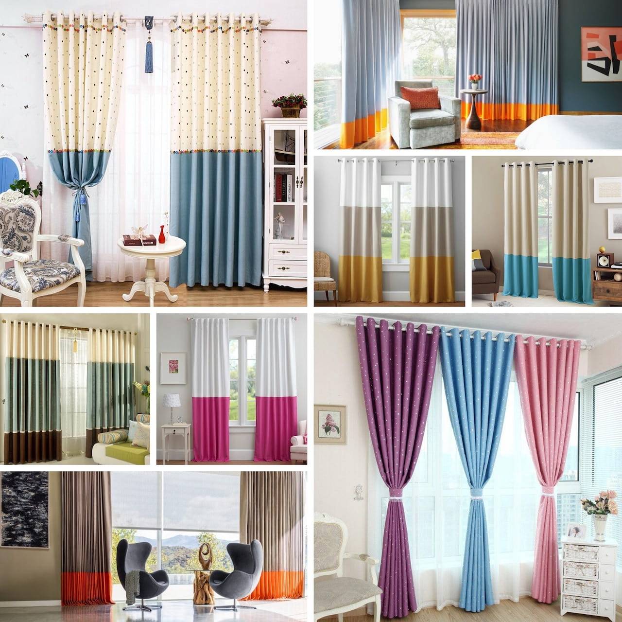 Такие шторы относятся к универсальному варианту, который значительно облегчает подбор занавесок к цвету стен или к обоям. Colorblock состоит из двух сшитых по горизонтали блоков контрастных оттенков. Нестандартный фасон даёт возможность проявить свою фантазию, и удачно экспериментировать.