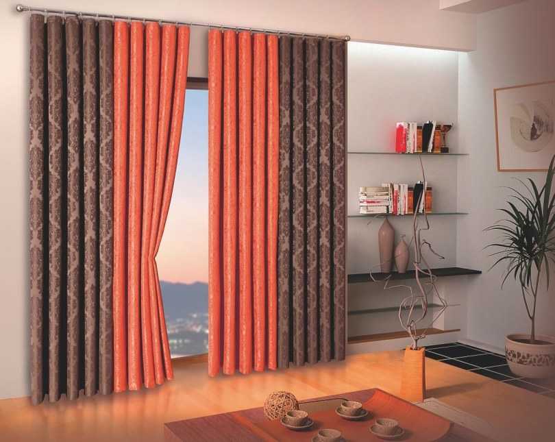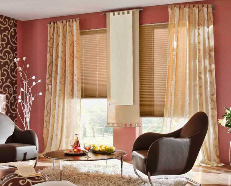 Контрастные сочетания можно заменить сходной цветовой гаммой, грамотным сочетанием двух орнаментов. Идеально – если сочетание двух тканей на шторах будет соответствовать двум оттенкам обоев в комнате.