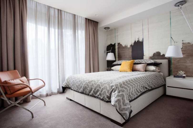 При наличии высоких потолков хорошим решением окажутся сплошные занавеси, до пола, которые придадут спальне налет респектабельности. Для квартир с малой высотой рекомендуется добавлять небольшой потолочный карниз, который будет визуально увеличивать пространство.