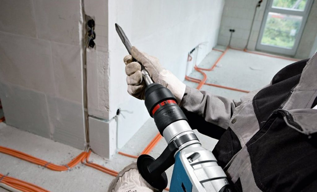 Для резки борозд в патрон перфоратора устанавливают специальную насадку (например, бур или лопатку) из высокопрочной стали. Затем мастер проходит инструментом вдоль линий разметки, но полученные пазы имеют неравномерное сечение. Для повышения качества работ необходимо предварительно высверлить отверстия, а затем выбить перемычки лопаткой.