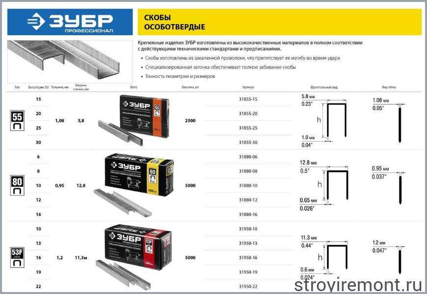 В первую очередь необходимо определиться с назначением. Если работать по дереву, ткани, коже, полотну, можно подобрать специальный инструмент для мебели. Если же предполагается работать и с другими поверхностями, необходимо выбрать строительный механический или электрический степлер. Он отличается большей производительностью и позволяет работать с различными по габаритам скобами и гвоздями. Следует учесть размеры и форму оснастки. Например, скобы бывают 4 основных типов – 53, 140, 28 и 36. Они отличаются формой и габаритами. Чем большая глубина требуется для вбивания, тем более габаритной должна быть и оснастка. Стандартный вариант длины скобы – до 14 мм