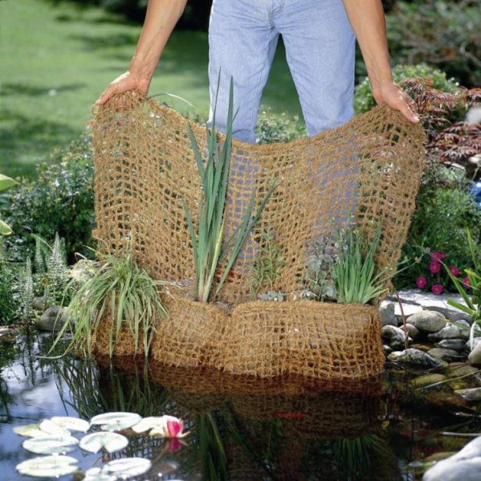 Интересно: кроме пленки и бетонирования, есть еще один способ укрепления берегов и дна бассейна. Для этого используется так называемый кокосовый мат. В отличие от других 100% натуральных волокон, от хорошо выдерживает длительное пребывание в воде. При этом на него можно сразу же высаживать водяные растения – получается «два в одном», способ армирования грунта и корзины для быстрой рассадки.
