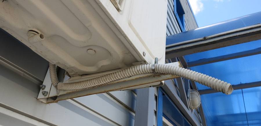 - Дренажному шлангу, выходящему наружу, нужно придать правильный уклон, устранить появившиеся изгибы, а затем зафиксировать так, чтобы ветер не задувал внутрь.