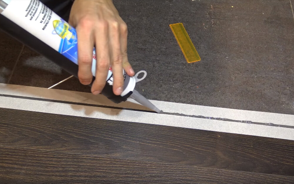 - Между ламинатом и компенсатором злейте аккуратно герметик для фиксации шва.