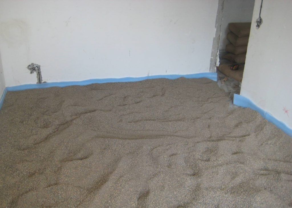 Роль гидроизоляции обычно выполняет толстая полиэтиленовая пленка. В качестве засыпки применяется керамзит, вспученный вермикулит или перлит. С одной стороны этот материал выполняет функцию звукоизоляции и утепления, а с другой помогает выполнить выравнивание пола, имеющего сильные перепады по высоте.