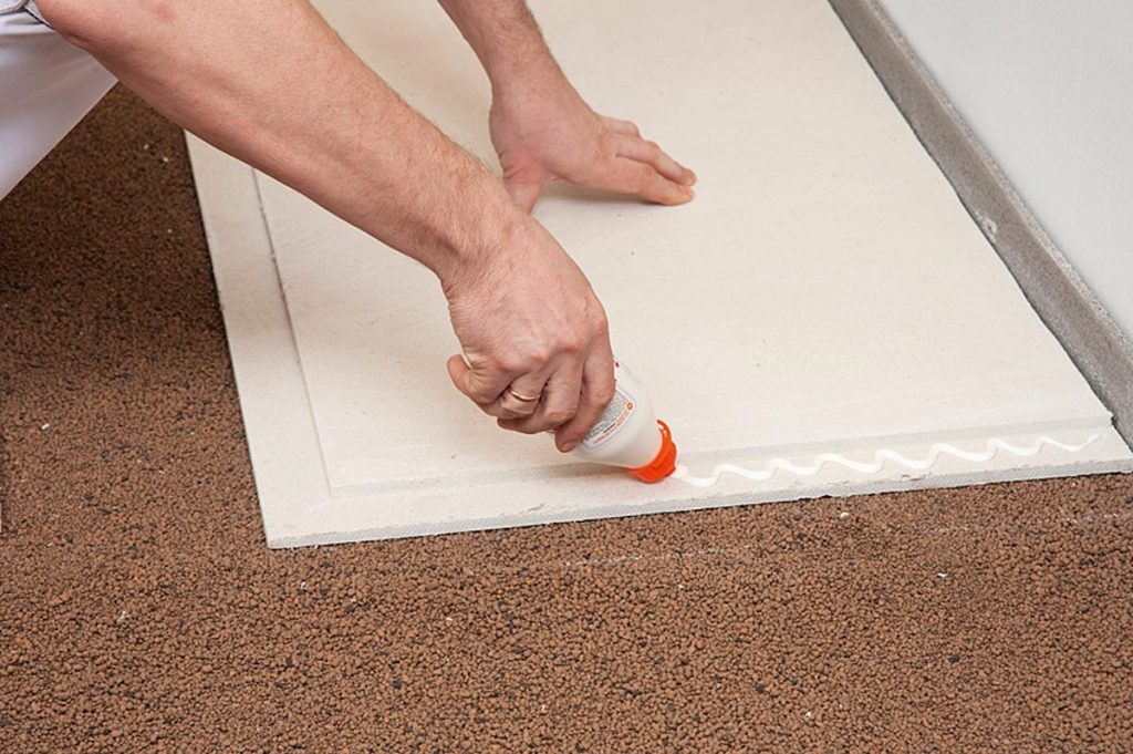 - В случае применения «суперпола Кнауф» фальцы плит нужно промазывать клеем и соединять их особыми саморезами, имеющими длину 19 мм. У этих саморезов есть зенкующие головки, благодаря которым крепежи глубоко утапливаются в ГВЛ. Это помогает в процессе укладки избавиться от ненужных перепадов высот.