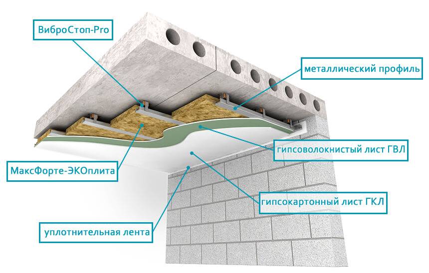 Шумоизоляция потолка это целая система – «слоёный пирог», в котором каждый «слой» выполняет свою задачу.