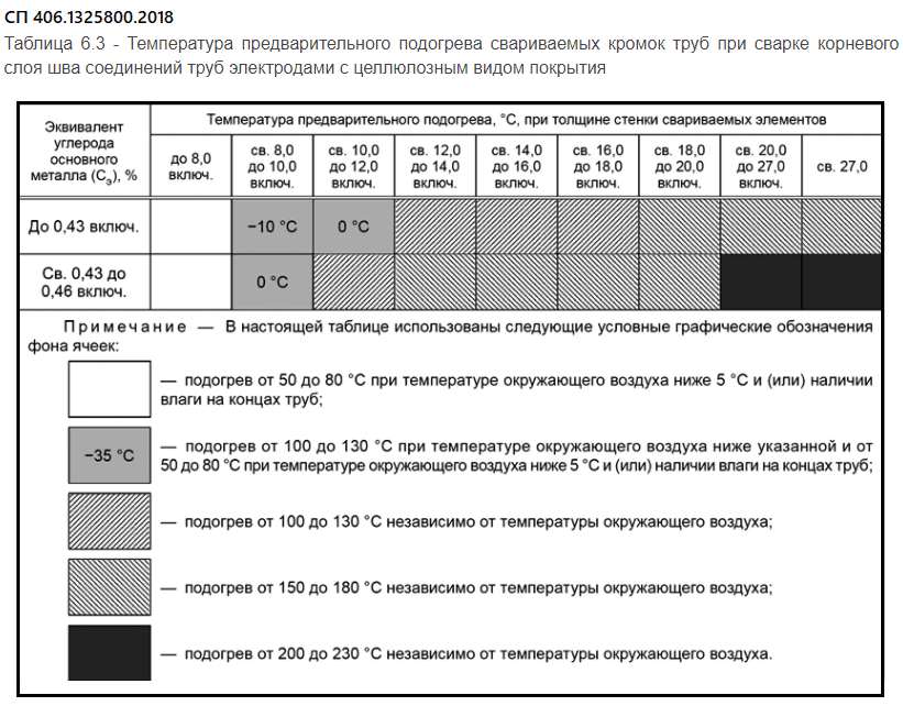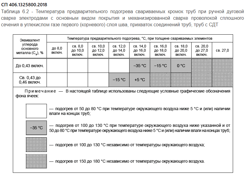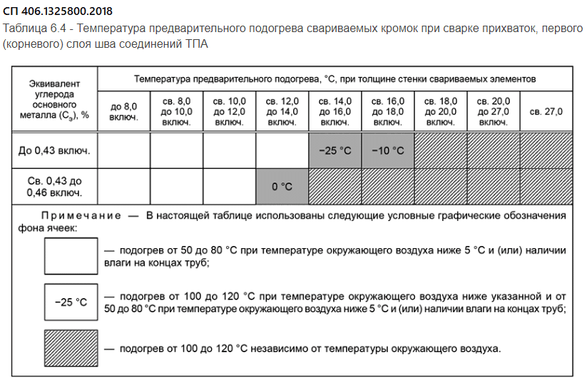 Температура предварительного подогрева определяется по таблицам 6.2-6.4 СП 406.1325800.2018 в зависимости от слоя шва