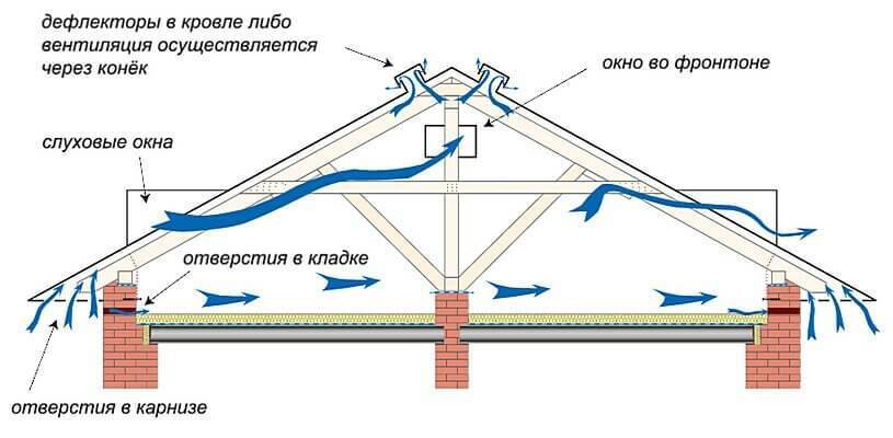 Рекомендуется в карнизном свесе крыши для притока воздуха оставлять вентиляционные отверстия общей площадью равной 1/400 — 1/600 площади кровли. В верхней части крыши для выхода воздуха делают отверстия такого же размера.