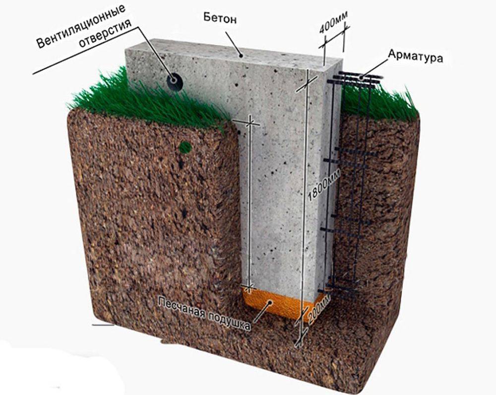Наиболее распространенный вид фундамента — ленточный, он представляет собой монолитное основание из бетона