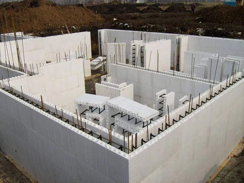 - Стены собираются из пустотелых бетонных блоков. Они изготавливаются непосредственно при возведении кладки с помощью переносной опалубки.