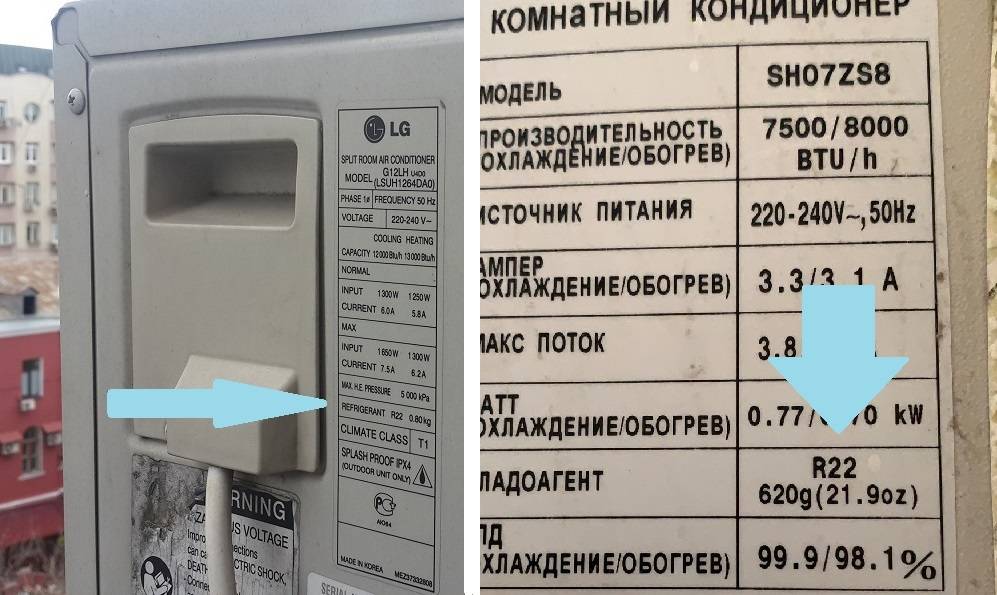 Если вы не знаете, на каком хладагенте работает ваш кондиционер, самый простой способ узнать это – посмотреть на шильдике. Он находится с правой стороны внутреннего и наружного блоков (см. фото). Чаще всего тип и вес хладагента указан на внешнем блоке.