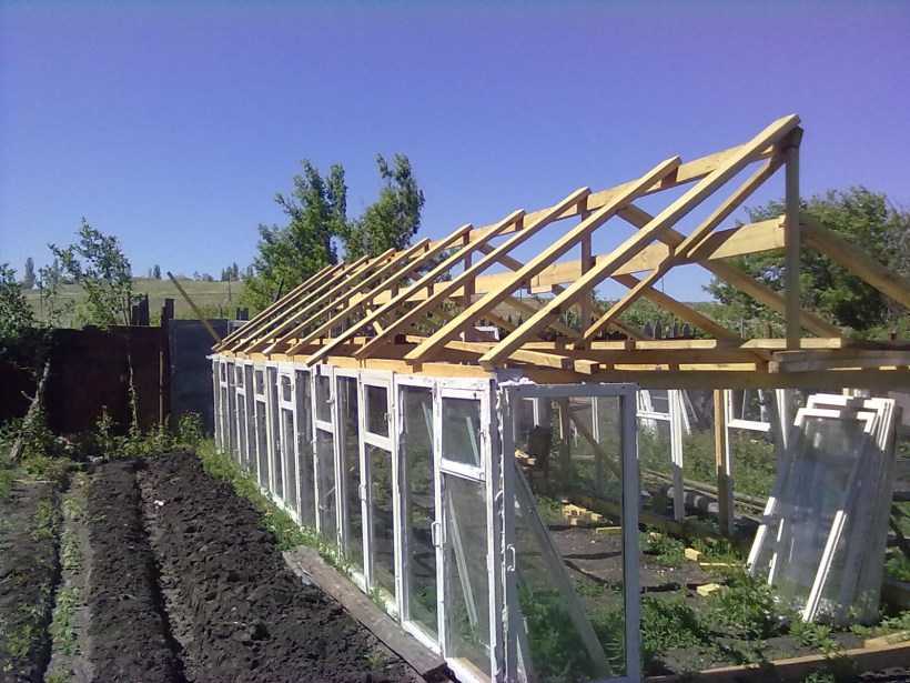 Для зимней теплицы своими руками легче сделать двускатную крышу под углом 20-40 градусов. Наклон выбирается исходя из несущей способности сооружения по отношению к атмосферным нагрузкам (сток воды, снег, ветер). Чтобы смонтировать кровлю самостоятельно, понадобится укладка 2-х обвязочных брусьев по боковым стенкам. После к ним крепят коньковый прогон с помощью парных стропил. Для деревянного конька и обвязки выбирают стойки сечением 120х150 мм, для стропилин – 70х100 мм. Металлическая кровля не отличается от основного каркаса, ее трубы свариваются между собой.