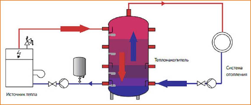 Поднять на значительную величину экономичность отопительной системы, сделать ее более эффективной, упростить операции, связанные с эксплуатацией, заставить работать более равномерно смогли бы специальные устройства, подключаемые к общей схеме. Они могли бы аккумулировать тепло, не востребованное по любой причине, чтобы отдавать его затем при надобности.