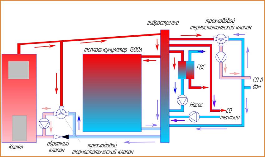 Котел быстро и без остановок отдает тепло от сжигаемого топлива в тепловой аккумулятор, а он в свою очередь медленно и в нужном режиме отдает это тепло в систему отопления. Объем системы гораздо меньше, чем объем емкости аккумулятора.