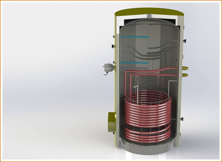 - и/или теплообменник (змеевик), подключаемый к дополнительным источникам тепла (солнечные коллекторы, тепловые насосы и пр.).
