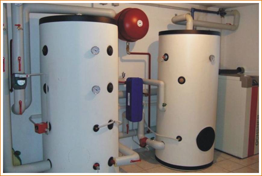 Если нет возможности разместить в непосредственной близости от котла резервуар требуемого объема, можно последовательно подключить два и более теплоаккумулятора небольшого размера.