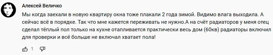 Единственный плюс радиаторной системы – это отсутствие проблем с “плачущими” окнами. Но и это все решаемо хорошими стеклопакетами (профиль от 70мм) и вентиляцией.