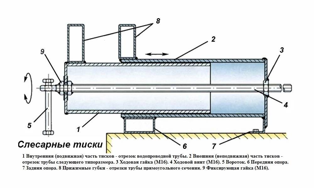Хорошие зажимные губки для стоит сделать из небольших прямоугольных труб. Их нужно закрепить к неподвижной и подвижной деталям устройства. Чтобы тиски были намного устойчивее, к низу неподвижной железной трубы необходимо приварить несколько опор. Их роль могут выполнять прямоугольные трубы и куски уголков.