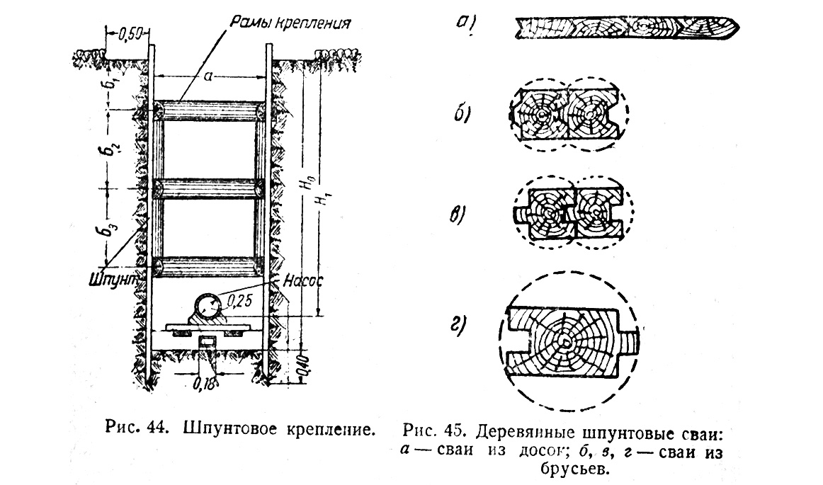 На сыпучих и плавучих почвах укрепление стен выемок осуществляется шпунтовым рядом. Это сплошная конструкция из деревянных планок и маячных свай. Согласно разработкам Мосинжпроекта, рамное крепление котлованов одновременно является и оградой при водоотведении от объекта.