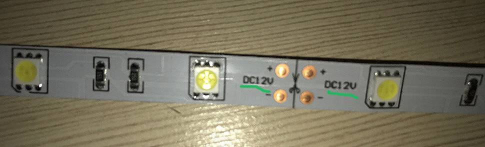 Чаще всего светодиодная лента представляет собой цельный пятиметровый отрезок, который намотан на пластиковую катушку. Как правило, с внешней стороны — на незамотанный на катушке конец — к ленте подсоединяются провода, необходимые для соединения с блоком питания. Если же после покупки обнаружилось отсутствие соединительных проводов, то следует взять любые многожильные провода красного («+») и чёрного («-») цвета, отмерить нужную длину, которой должно быть достаточно, чтобы достать до клемм блока питания, и припаять их, предварительно зачистив и облудив оба конца.