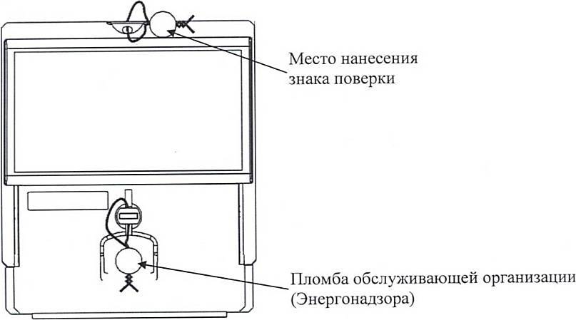 Рисунок 5 – Схема пломбировки от несанкционированного доступа, обозначение места нанесения знака поверки счетчиков «Меркурий 201.7», «Меркурий 201.8», «Меркурий 201.82», «Меркурий 201.9»