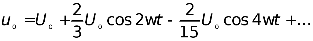 Как видно из рис. 2.1,в,выпрямленное напряжение имеет пульсирующий характер. Разложение такой периодической функции в ряд Фурье показывает, что она состоит из суммы постоянной составляющей(U)и четных гармонических составляющих, т.е.