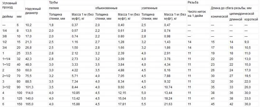 Таблица условных проходов, наружных диаметров, толщин стенок и массы труб, а также количества витков и длин конической и цилиндровой резьбыИсточник spark-welding.ru