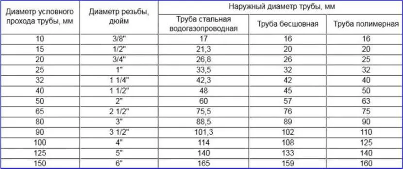 Таблица соответствия диаметров дюймовой резьбы и размеров условного прохода, а также наружных диаметров стальных, полимерных и бесшовных трубИсточник montagtrub.ru