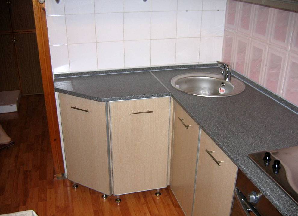 когда все заготовки в наличии, можно собирать угловой сегмент. Для начала монтируют боковины, их прикрепляют ко дну тумбы. Далее устанавливают и закрепляют соединительные планки. Затем прикручивают ножки. Размечают и вырезают выемки для креплений дверей. Устанавливают их, навешивают дверцы. В зависимости от вида мойки, накладная или врезная, подготавливают столешницу для того, чтобы монтировать раковину. Для того чтобы сделать отверстие в столешнице используют электролобзик. Предварительно делают разметку на столешнице по форме мойки. Врезную мойку устанавливают только на герметик